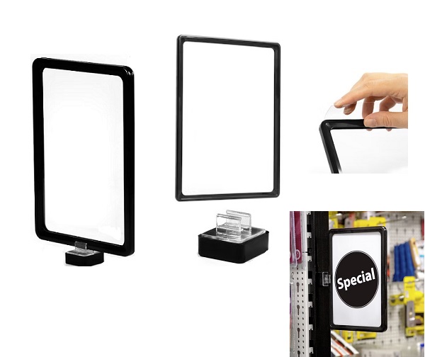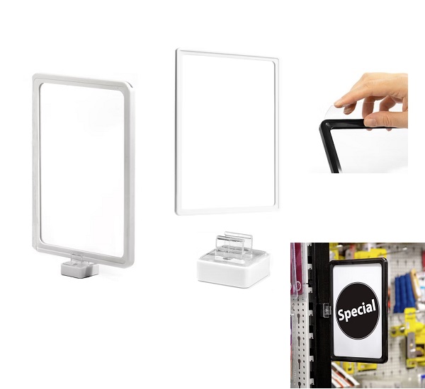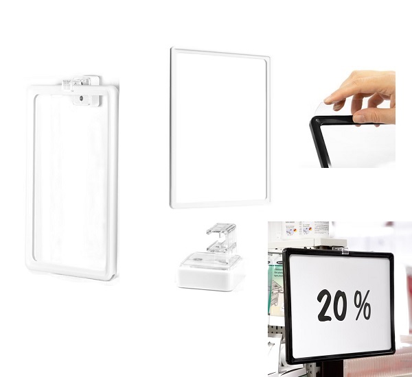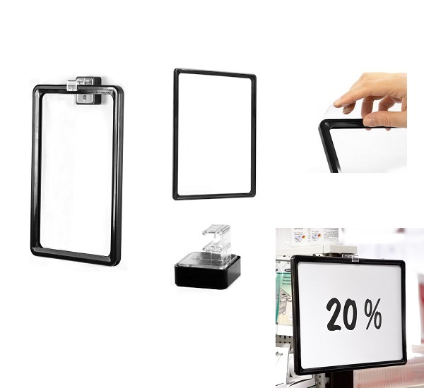 Praktische Ferrit-Magnethalter mit horizontalem Adapter, mit dem Plakatrahmen an ferromagnetischen Flächen befestigt werden können. Die magnetischen Halterungen ermöglichen im Handumdrehen eine einfache und flexible Positionierung von Plakatrahmen. Ideal geeignet für den Einsatz im Einzelhandel oder in Lagerbetrieben, um Regale ohne Bohren und Schrauben mit Plakatrahmen auszuzeichnen.